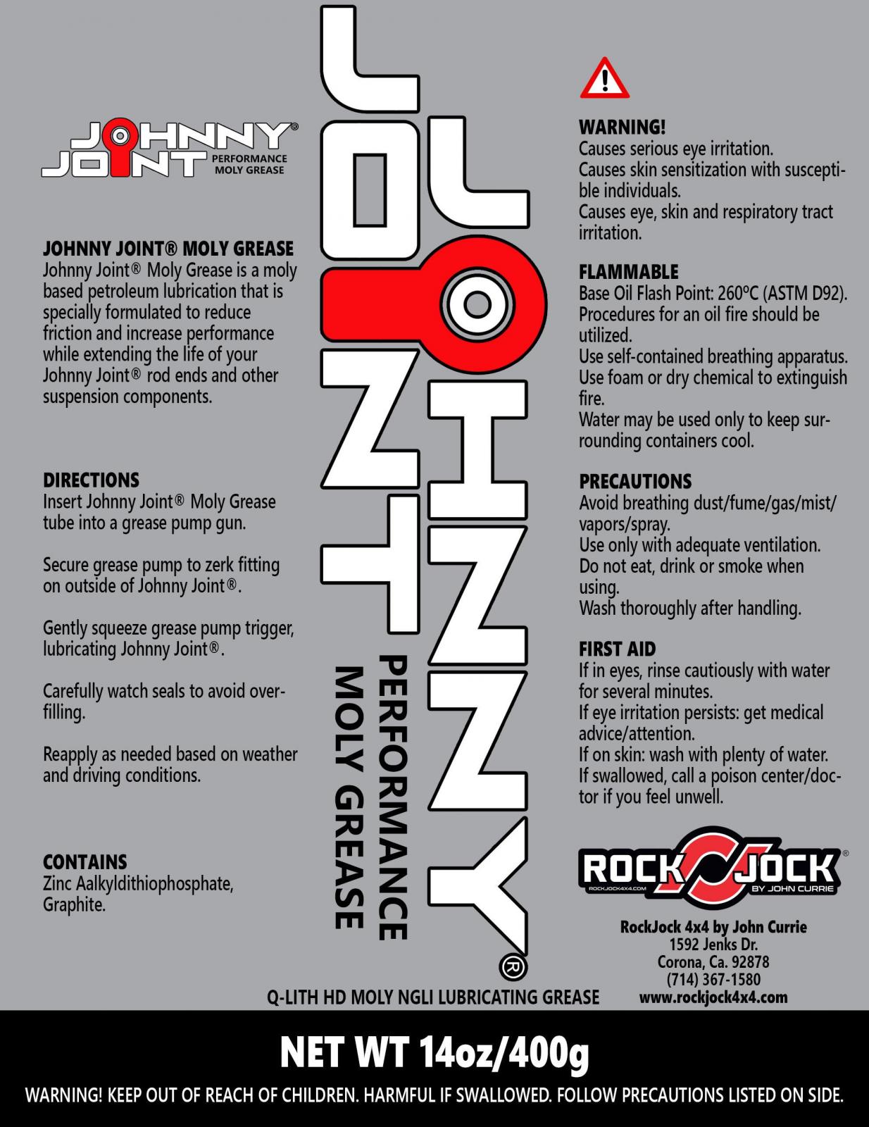 RockJock's premium quality, long lasting grease has be proven in all of our own competition and recreational vehicles over the last 15 plus years. Non-moly and synthetic greases eventually dry up and cause squeaking, friction and component wear. We only use moly grease for maximum longevity and smooth quiet operation of components